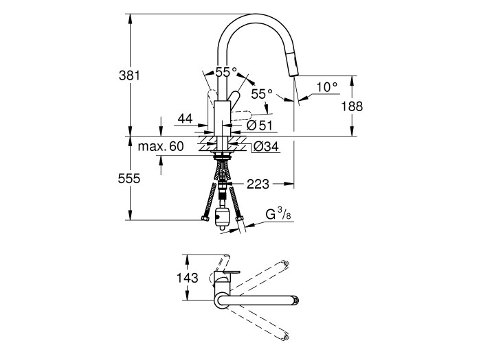 GROHE SpeedClean - предотвращение образования известковых отложений. GROHE SilkMove - плавность хода рычага. GROHE StarLight - хромированное покрытие. GROHE EasyDock - облегчённое использование выдвижной части излива смесителя. GROHE SmoothTurn - плавный поворот излива. GROHE Zero - технология сплава для изготовления смесителей, который не содержит свинец, устойчив к коррозии и долговечен. GROHE Pull-out Dual Spray - 2 режима подачи воды, лейки выдвигаются на длину 40-50 см.