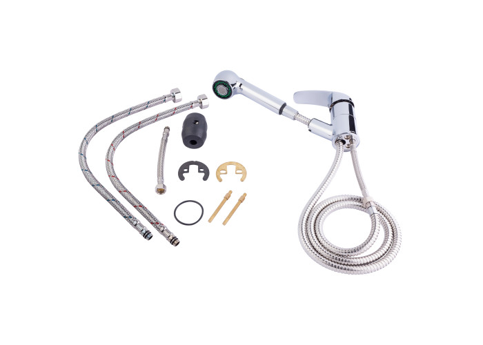 Смеситель, шланг для выдвижной лейки, гибкая подводка, крепежи, якорь.