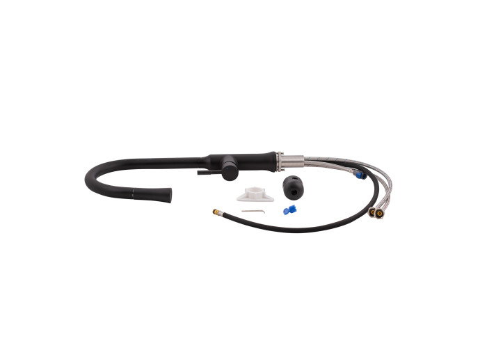Смеситель, шланг для выдвижной лейки, гибкая подводка, ключ для аэратора, крепежи, якорь.