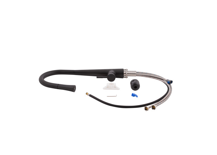 Смеситель, шланг для выдвижной лейки, гибкая подводка, ключ для аэратора, крепежи, якорь.