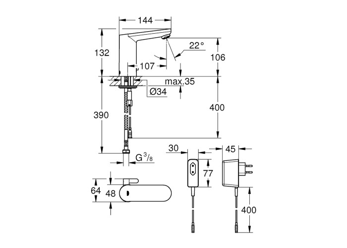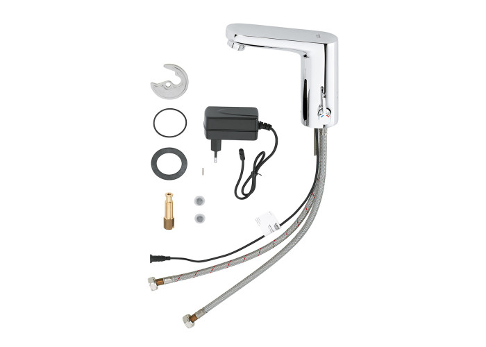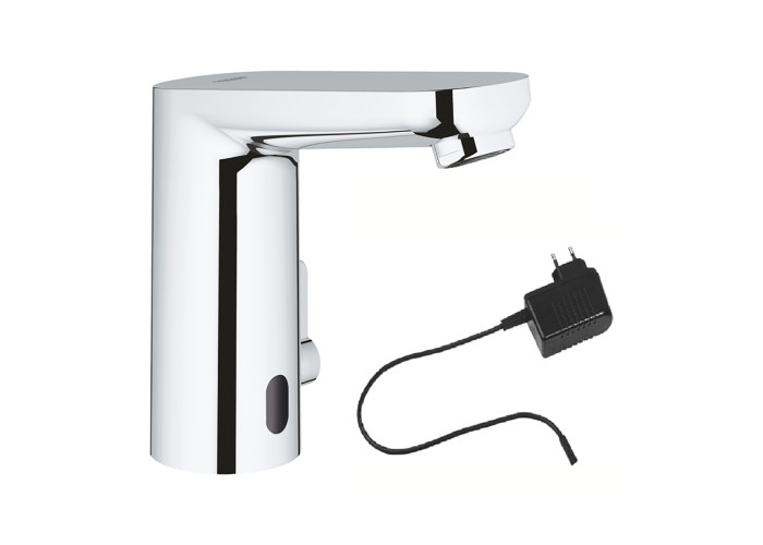 Смеситель для раковины бесконтактный Grohe Eurosmart Cosmopolitan 36325001 изготовлен из латуни. Глянцевая хромированная поверхность придает не только долговечность смесителю, но и оригинальный внешний вид. Управление происходит с помощью инфракрасного датчика движения. Подключение воды происходит через гибкие шланги с диаметром подключения 3/8", которые входят в комплект поставки. Выполнен в современном стиле и удобен в использовании.