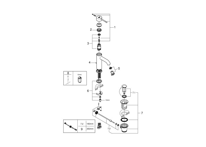 GROHE SilkMove - плавность хода рычага. GROHE StarLight хромированная поверхность. GROHE EcoJoy - водосберегающая технология. GROHE AquaGuide - регулируемый носик сливного отверстия для настройки потока воды, 5,7 л/мин. GROHE QuickFix Plus - быстрый и удобный монтаж.