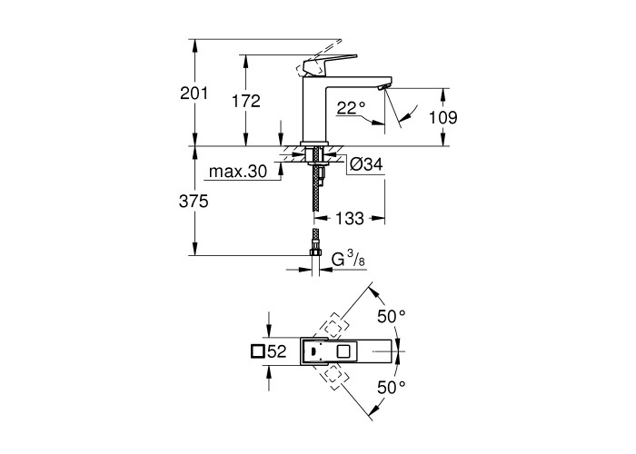 Змішувач для раковини Grohe Eurocube 23446000 виготовлений з високоякісної харчової латуні, яка стійка до впливу корозії, ударів і тріщин. Глянсове хромоване покриття не тільки підвищує довговічність змішувача, а й надає йому привабливості. Змішувач має одноважільне управління, за допомогою якого можна відрегулювати температуру і напір холодної та гарячої води. Підключення води відбувається через гнучкі шланги з діаметром підмикання 3/8". Виконано в сучасному дизайні.