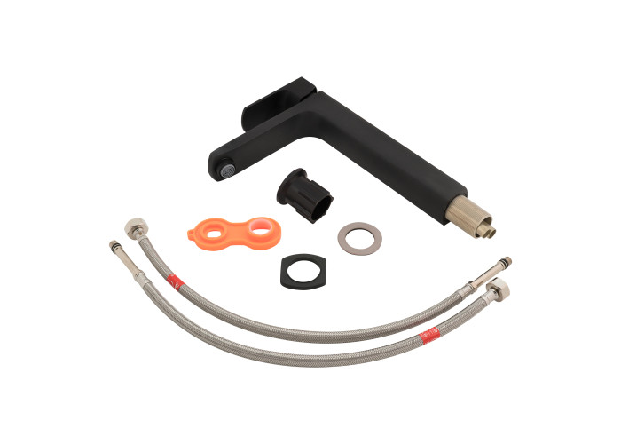 Смеситель, гибкая подводка, ключ для аэратора, крепежи.
