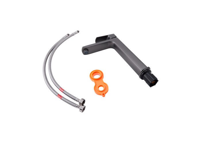 Смеситель, гибкая подводка, ключ для аэратора, крепеж.