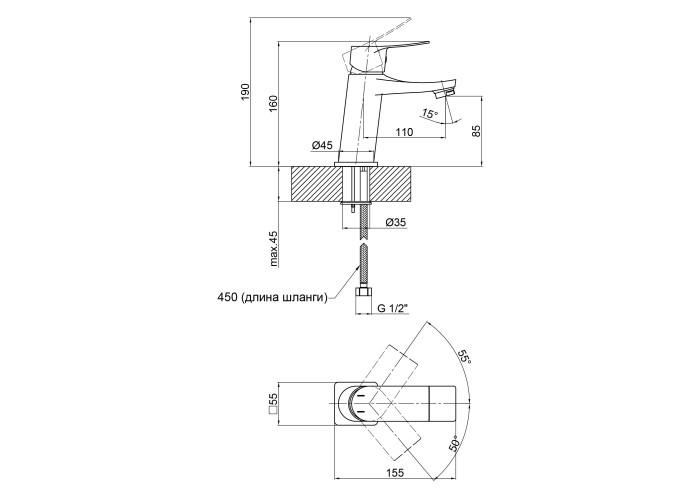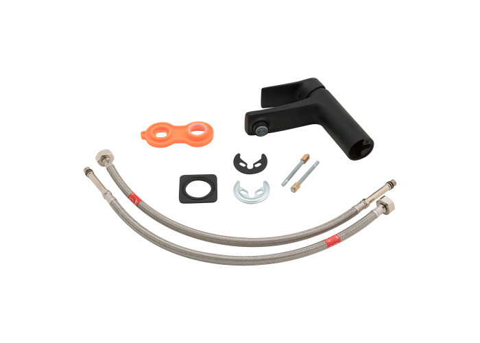 Смеситель, гибкая подводка, ключ для аэратора, крепежи.
