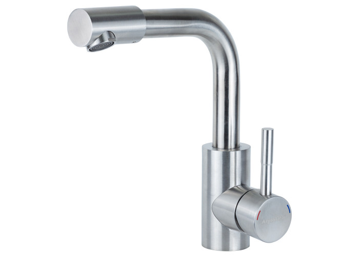 Смеситель KT Ø35 для раковины Г-гусак на гайке SS AQUATICA (KT-1A370P). Минимальное давление в системе водоснабжения: 0.5 бар. Максимальное давление в системе водоснабжения: 10 бар. Водородный показатель воды (pH): 6.5-8.5. Общая минерализация воды: не более 1500 г/м³. Только для чистой воды без примесей, содержащих абразивы (песок, глину, известь и т.д.). KT-1A370P – это однорычажный смеситель для раковины , изготовлен из нержавеющей стали, устойчивой к коррозии. Изделие имеет современный дизайн, выражающийся в Г-образной форме излива, поэтому гармонично впишется в интерьер кухни в стиле «хай-тек» или «лофт». Смеситель для умывальника KT-1A370P имеет следующие особенности: удобство использования (высокий поворотный излив); привлекательный внешний вид; аэрация потока воды; плавная регулировка напора и температуры струи; износоустойчивый керамический картридж. Крепится смеситель для раковины KT-1A370P к горизонтальной поверхности на втулку (гайку). Для монтажа в комплекте предусмотрен гибкий подвод. Гарантия предоставляется в течение 3-х лет с момента покупки.