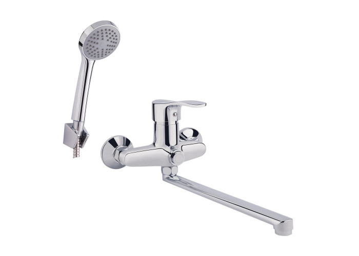 Смеситель для ванны GF (CRM)/S-03-005AB с длинным поворотным изливом изготовлен из силумина, укомплектован кронштейном для ручного душа, душевым шлангом и лейкой. Для включения потока воды предусмотрено выгнутый рычаг с нанесенной маркировкой Х+Г воды, для переключения на душ - нажимной дивертор. Настенный монтаж осуществляется с помощью крепежных деталей, которые входят в комплект. Круглые розетки скроют следы установки на отделке.