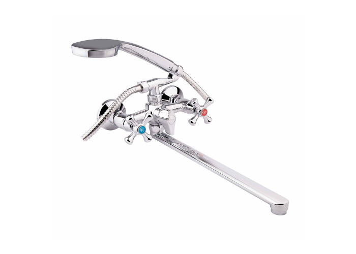 Смеситель для ванны GF (CRM)/S-21-141 с длинным поворотным изливом изготовлен из силумина, укомплектован шланговым подключением, душевым шлангом и лейкой. Для включения потока воды предусмотрено два вентиля с нанесенными маркировкой Х+Г воды и фирменными логотипами производителя, для переключения на душ - поворотный дивертор. Настенный монтаж осуществляется с помощью крепежных деталей, которые входят в комплект. Круглые розетки скроют все погрешности установки на отделке ванной комнаты.