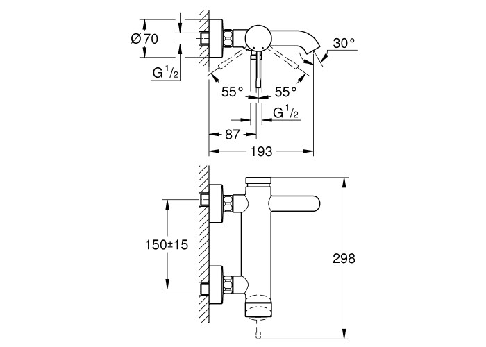 Змішувач для ванни Grohe Essence New 33624AL1 виконаний з латуні та має хромовану сяючу поверхню, яка стійка до утворення корозії, забруднень і стирання. Перераховані вище характеристики виробу гарантують його довговічність. Для вмикання подачі води змішувач обладнаний зручним важелем з нанесеним маркуванням Х+Г води, а для перемикання на душ - дивертором і виходом для під‘єднання душового шланга. Круглі розетки приховають похибки настінного монтажу.