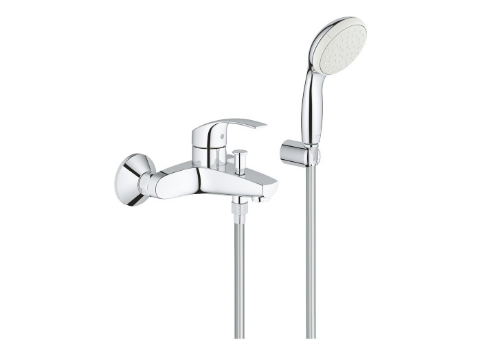 Смеситель для ванны Grohe Eurosmart 3330220A выполнен из латуни и имеет хромированную сияющую поверхность, которая устойчива к образованию коррозии, загрязнениям и истиранию. Вышеперечисленные характеристики изделия гарантируют его долговечность. Для включения подачи воды смеситель оснащен удобным рычагом с нанесенной маркировкой Х+Г воды, а для переключения на ручной душ - нажимным дивертором, держателем ручного душа и лейкой. Круглые розетки скроют все погрешности настенного монтажа.