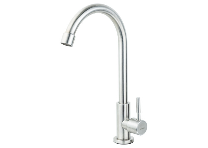 Смеситель KT 1/2" монокран на гайке SS AQUATICA (KT-1G170P). Минимальное давление в системе водоснабжения: 0.5 бар. Максимальное давление в системе водоснабжения: 10 бар. Водородный показатель воды (pH): 6.5-8.5. Общая минерализация воды: не более 1500 г/м³. Только для чистой воды без примесей, содержащих абразивы (песок, глину, известь и т.д.). Cмеситель для раковины модель KT-1G170P изготовлен из нержавеющей стали и является монокраном, то есть рассчитан на подачу одного вида воды. Данный тип смесителя отлично впишется в интерьер загородного дома, кафе, ресторана. Благодаря плавным формам корпуса и благородному матовому отблеску, изделие имеет эстетичный внешний вид и защищено от механических повреждений. Смеситель для умывальника монокран обладает рядом преимуществ: удобство использования (высокий поворотный излив);простота конструкции; плавная регулировка напора и аэрация потока воды; износоустойчивость кран-буксы (выполнена из латуни); легкий способ монтажа. Крепится смеситель для раковины KT-1G170P к горизонтальной поверхности с помощью гайки. Гарантия на изделие предоставляется сроком на 36 месяцев, считая с дня покупки.