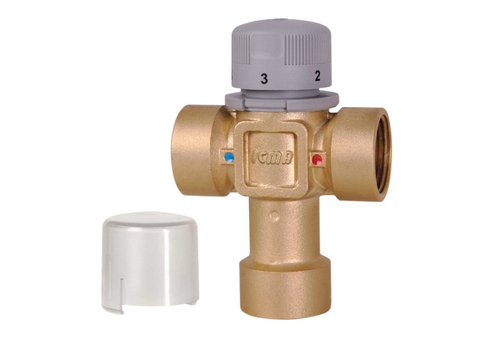 Термостатический смеситель. Муфтовые присоединения с наружной резьбой. Диапазон регулировки температуры 30-60°C. Максимальная температура воды на входе 85°C. Боковые входы для горячей и холодной воды. Выход смешанной воды расположен снизу.
