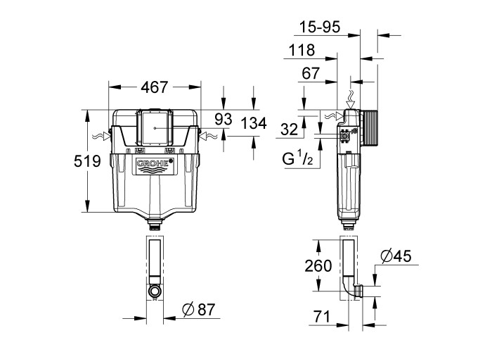 Регулировка объёма смыва от 6 до 9 л. Пневматический смывной клапан с тремя режимами слива: 2-х объёмный, старт/стоп, или непрерывный. Подключение воды: справа, слева, сзади или сверху. Арматурная гру