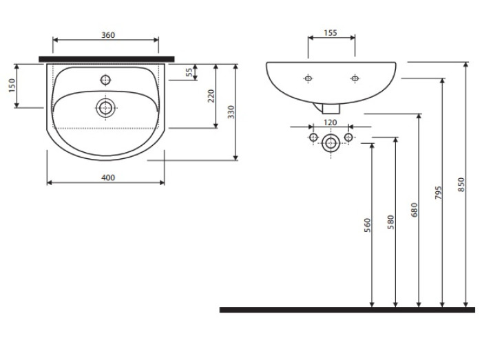 Умывальник мебельный, 400*330 мм, санфаянс, округлой формы, с переливом, 1 отверстие, подвесной