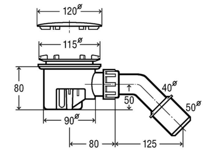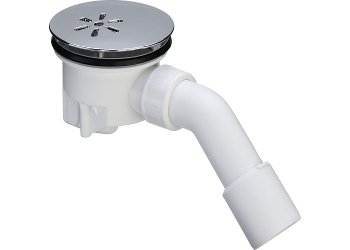 Сифон для душевого поддона, комплектация : съемное устройство для защиты от неприятного запаха из системы канализации, сливное колено 45°, хромированная накладка сливного отверстия