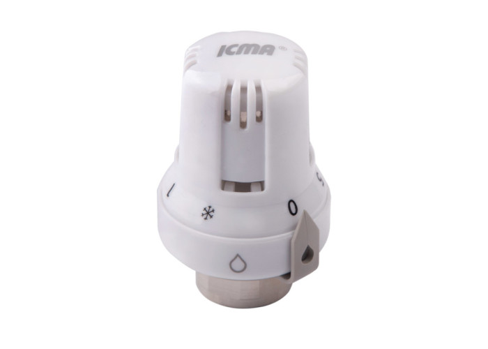 Термостатическая головка для терморегулирующих и термостатических вентилей. Парафиновый элемент. Резьба М28х1,5ю. Ручная система блокировки температуры на выбранном значении. Принцип работы термоголовки основан на сжимании и расширении внутреннего цилиндрического гофрированного устройства наполненного специальной жидкостью. При увеличении комнатной температуры теплочувствительный цилиндр расширяется и давит на шток терморегулирующего вентиля, который в свою очередь, перекрывает проходное отверстие вентиля, тем самым, уменьшая количество воды поступающей в радиатор. При уменьшении комнатной температуры цилиндр сжимается, открывая вентиль, таким образом, вода в радиатор поступает в большем количестве и температура в помещении увеличивается.
