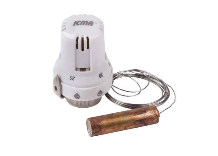 Термостатическая головка с погружным датчиком. Диапазон регулировки 20°-70°C. Применяется со штуцером арт. 189. Особо рекомендована установка в системе «Теплый пол» для регулировки температуры. Ручная система блокировки температуры на выбранном значении.
