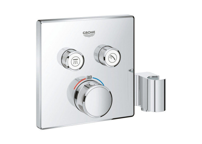 Термостат для скрытого монтажа на 2 выхода с держателем для лейки ручного душа Grohe Grohtherm SmartControl 2912500 выполнен в квадратной форме. Управление потоком воды осуществляется поворотом вентиля влево и вправо. Отличительной чертой этого сантехнического элемента является скрытый монтаж, что позволяет сэкономить пространство в ванной комнате за счет того, что внутренняя часть смесителя монтируется в стену, а снаружи выводится панель управления. Смеситель оснащен переключателем потока между верхним и ручным душем. Устойчивость хромированной поверхности StarLight к царапинам и потускнению в 10 раз выше, чем у других производителей. Для полной комплектации необходимо докупить встраиваемый механизм.