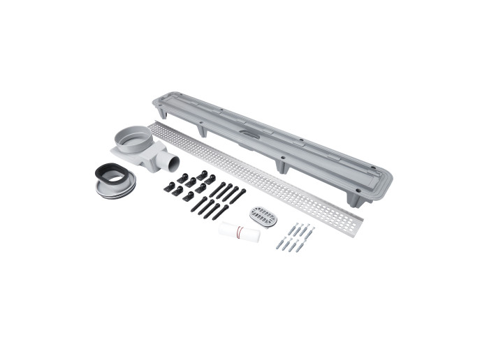 Трап, сухой и мокрый затвор, гидроизоляционный комплект, ножки, крепежи.