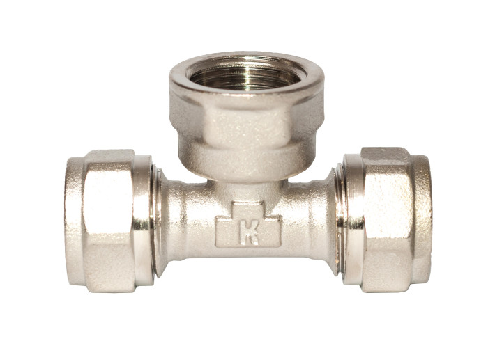 Тройник обжимной, диаметр 16 мм диаметр 1/2 "внутренний, RSk Италия латунный никелированный. Обжимные -фитинги RSk предназначены для создания неразъемных соединений трубопроводов из металлополимерных труб (PEX-AL, PE-AL, PERT-AL). Для их производства используется высококачественная латунь CW617N. Готовая продукция имеет никелированное покрытие. Фитинги под обжим используются для создания систем водопроводов и отопления. Ассортимент бренда RSk состоит из муфт, тройников и угольников, в том числе и настенных сантехнических уголков. Представлены модели как соединительного типа, так и с переходом на наружную либо внутреннюю резьбу. Имеются как равнопроходные, так и редукционные (переходные) опрессовочные фитинги разных размеров (16-32).Данные фитинги соответствуют всем европейским нормам и стандартам качества, имеют подтверждающие документы и за надежность, качество и долговечность пользуются большой популярностью у клиентов.