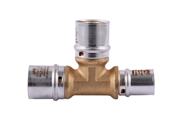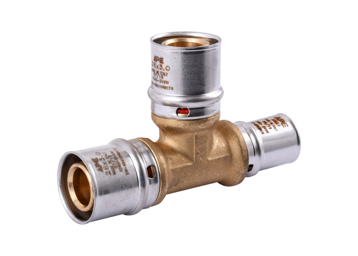 Материал корпуса это медный сплав, называемый CW617N , подходящий для горячего прессования Стойкость крепления между шлангом и фитингом гарантируется одновременным наличием двух уплотнительных колец (см. рис), расположенных в елочке и самой формой данной елочки. Крепление происходит за счет перманентной деформации втулки при помощи прессовального оборудования, имеющего соответствующие тиски. Сила пресса деформирует, в свою очередь, трубу на соответствующем профиле. Толщина втулки спроектирована и определена таким образом, что бы выдерживать значительные давления, так же при наличии колебаний температуры. Втулка изготовлена из нержавеющей стали AISI 304,проходящей процесс перевода в растворимое состояние для того, что бы устранить возможные остаточные напряжения, имеющиеся в металлах. Кроме того, таким образом, гарантируется равномерное распределение напряжений во времени. Имеет 2 отверстия для возможности визуального контроля соединения шланг - фитинг. Наличие шайбы из PTFE изолирует алюминий шланга от латуни фитинга для избегания возникновения коррозийных феноменов