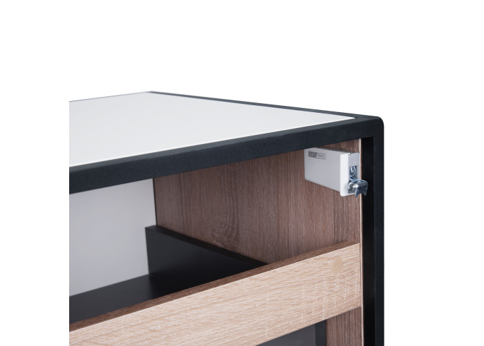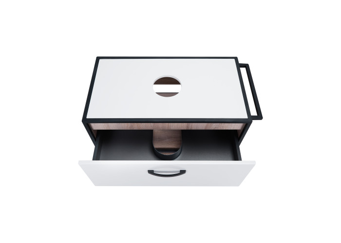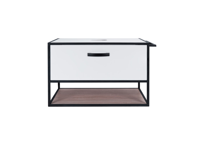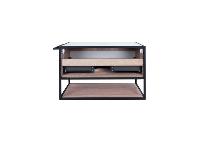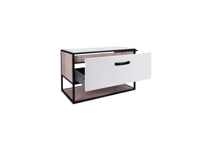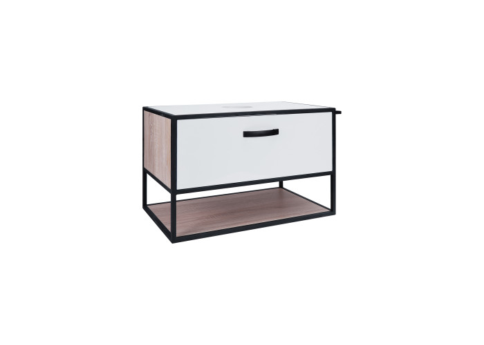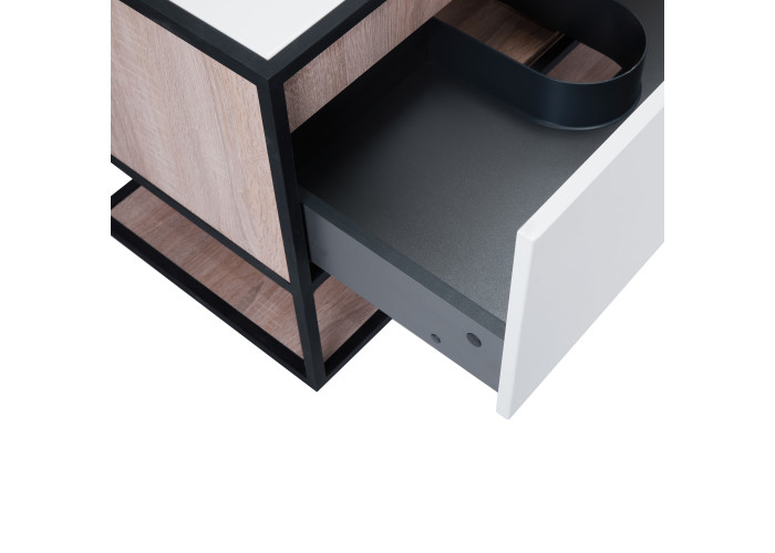 Подвесная тумба Qtap Taurus 800х476х469 White/Whitish oak со столешницей QT2479TPT803WWO выполнена с отверстием для установки накладной раковины, а так же отверстием под сифон. Двухцветный корпус тумбы изготовлен из ЛДСП, фасадная часть из МДФ. Изделие оснащено удобными и вместительным выдвижным ящиком с механизмом доводчика и полкой. Стальной крашеный каркас черного цвета придает тумбе оригинальный внешний вид, благодаря которому она впишется в дизайн любой современной ванной комнаты.