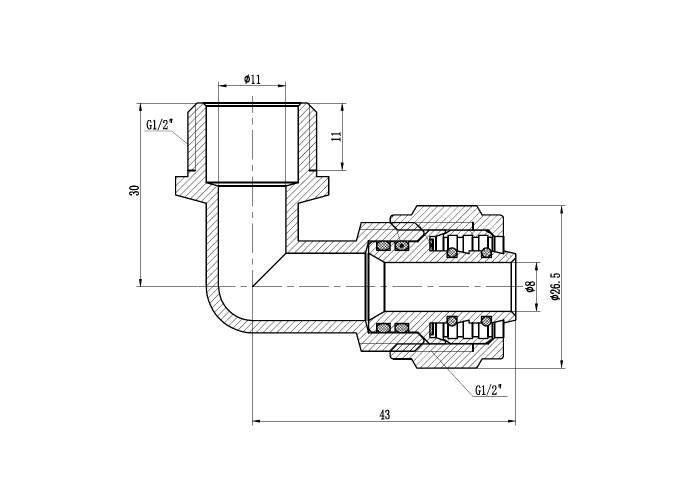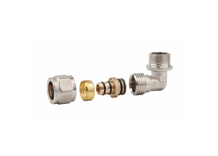 Уголок обжимной SD Forte Ø16х1/2" НР — разборной латунный фитинг с никелированным покрытием, обжимной, с переходом на наружную резьбу.