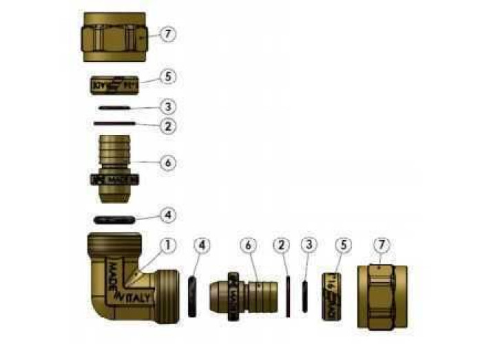 Углы промежуточные серии 751 L были спроектированы и реализованы для оказания помощи установщику, сокращая время на монтаж и увеличивая характеристики стойкости во времени. Кроме того, данная серия фитингов не требует особых инструментов для монтажа Стойкость крепления между трубой и фитингом гарантируется одновременным наличием двух уплотнительных колец (2), расположенных в елочке (6 )и особой, противоскользящей, формой самой елочки (в виде зубов пилы). Крепление трубы происходит за счет особого вида прессования, состоящего из радиального прессования, полученного за счет завинчивания гайки (7 )которая определяет сжатие разрезанной оживальной части ( 5) вокруг трубы и осевого прессования, которое сжимает уплотнительное кольцо (4) на корпусе. Подобная система прессования гарантирует стойкость полученного соединения в любых условиях работы. Кроме того, работая на латуни в прессовании, исключаются риски возникновения микротрещин. Наличие шайбы (3) из PTFE изолирует алюминий трубы от латуни фитинга для избегания возникновения коррозийных эффектов