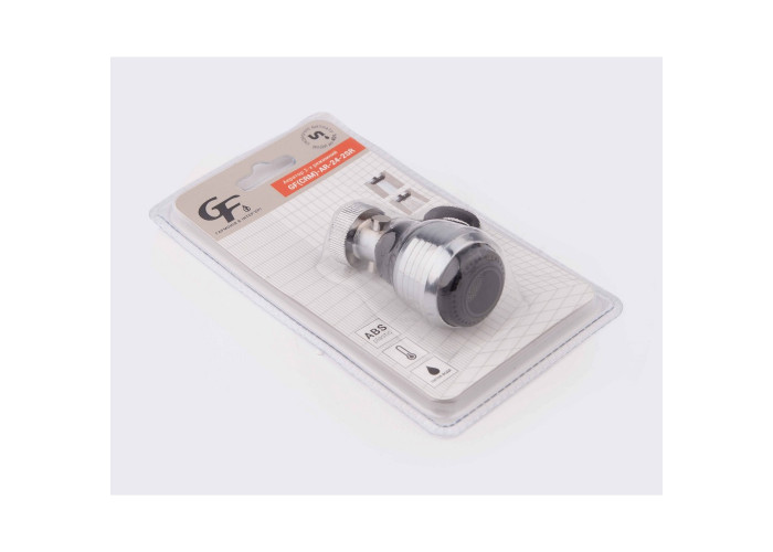 Аератор GF (CRM)-AR-24-2SR дозволить вам заощадити витрати води, а також зробити процес миття рук або посуду більш комфортним за рахунок зниження шуму, кількості хлору, і підвищення м‘якості струменя. Він виконаний з пластику та має хромовану блискучу поверхню. За формою нагадує циліндричний сітчастий фільтр. Виріб кріпиться безпосередньо на вилив змішувача вручну без зусиль.