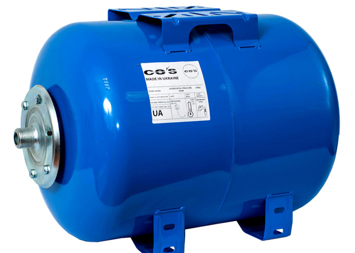 Гідроакумулятор виробництва Україна. Функції гідробака: накопичення води під постійним тиском, що дозволяє насосу включатися не відразу при витраті води з системи водопостачання, а тільки в міру зменшення кількості рідини (зменшення тиску) в гідроакумуляторі; захист системи водопостачання від гідроударів; збір резервної кількості води в системі водопостачання. Технічні характеристики: металевий корпус з легованої пофарбованої сталі; мембрана, виготовлена з синтетичної етилен-пропіленової гуми EPDM. Умови застосування: максимальна температура навколишнього середовища: +40 º; температура накопичуваної рідини: + 99ºС; тиск в повітряній порожнині до 1.6 бар; максимальний тиск в системі водопостачання до 8 бар; термін гарантійного обслуговування: 18 місяців.
