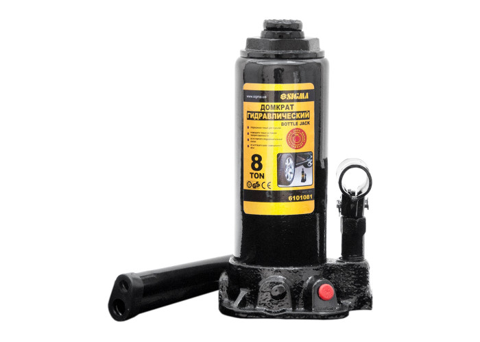 Домкрат гідравлічний пляшковий 8т H 230-457мм Sigma(6101081) відрізняє простота конструкції і зручного експлуатації, що розширює область його застосування і дозволяє ефективно виконувати роботи будь-якої складності. Його активно використовують для монтажу і демонтажу в будь-якій галузі (машинобудування, будівництво і т.д.), він придатний для ремонту автомобілів, колісних пар залізничних вагонів, а також в якості силового вузла пресів, трубозгибів, труборізів і іншого подібного інструменту. Гідравлічні домкрати, як випливає з назви, працюють на рідини. Принцип їх дії заснований на переміщенні поршня (плунжер) домкрата за допомогою створює тиск робочої рідини (гідравлічне масло) приводного насоса, за рахунок чого і відбувається підйом вантажу. Опускається вантаж при перекачуванні рідини зі склянки в резервуар насоса. Переваги: компактні розміри, що з одного боку полегшує роботу з домкратом, спрощує зберігання і транспортування, і з іншого боку дозволило зменшити витрату матеріалів і, як наслідок, ціну; домкра