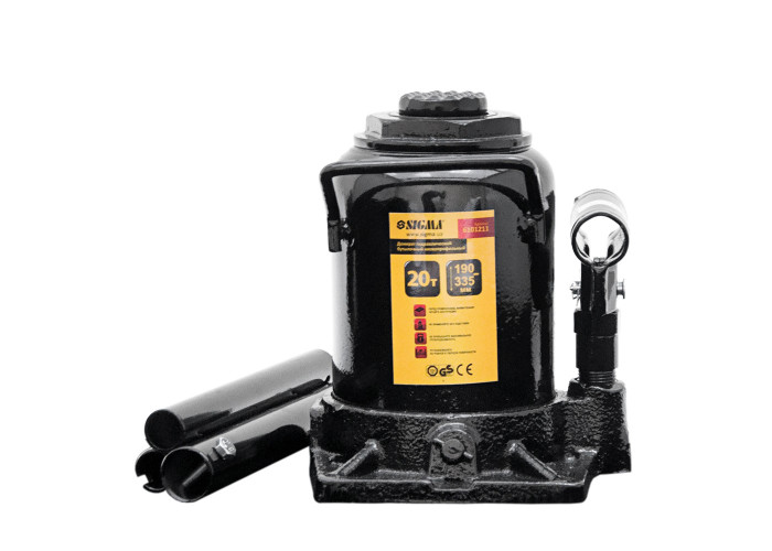 Домкрат гідравлічний пляшковий низькопрофільний 20т H 190-335мм Sigma (6101211) відрізняє простота конструкції і зручного експлуатації, що розширює область його застосування і дозволяє ефективно виконувати роботи будь-якої складності. Його активно використовують для монтажу і демонтажу в будь-якій галузі (машинобудування, будівництво і т.д.), він придатний для ремонту автомобілів, колісних пар залізничних вагонів, а також в якості силового вузла пресів, трубогибов, труборізів і іншого подібного інструменту. Гідравлічні домкрати, як випливає з назви, працюють на рідини. Принцип їх дії заснований на переміщенні поршня (плунжер) домкрата за допомогою створює тиск робочої рідини (гідравлічне масло) приводного насоса, за рахунок чого і відбувається підйом вантажу. Опускається вантаж при перекачуванні рідини зі склянки в резервуар насоса. Переваги: компактні розміри, що з одного боку полегшує роботу з домкратом, спрощує зберігання і транспортування, і з іншого боку дозволило зменшити витрату матеріалів і, як насл