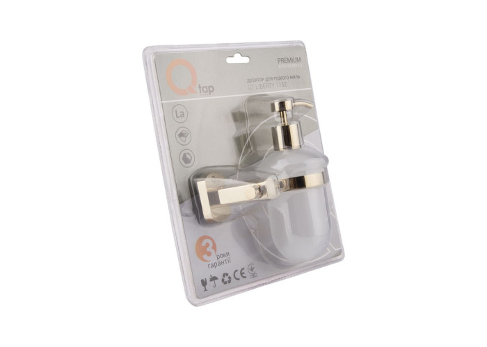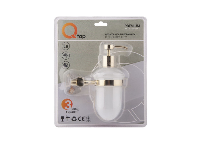 Дозатор для мила Qtap Liberty ORO 1152 робить процес миття рук гігієнічним і швидким. Латунний тримач дозатора у вигляді кронштейна з кільцем має антикорозійні властивості і кріпиться на стіну. Пляшка виконана з матового скла. Дизайн дозатора підходить за дизайном до будь-яких аксесуарів, чудово доповнить невеликі санвузли і, завдяки своїм розмірам, може кріпитися в будь-якому зручному та доступному місці. Не займає місце на раковині.