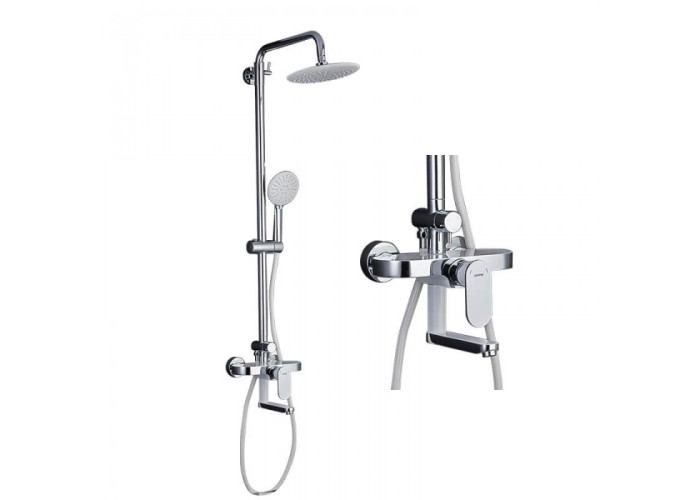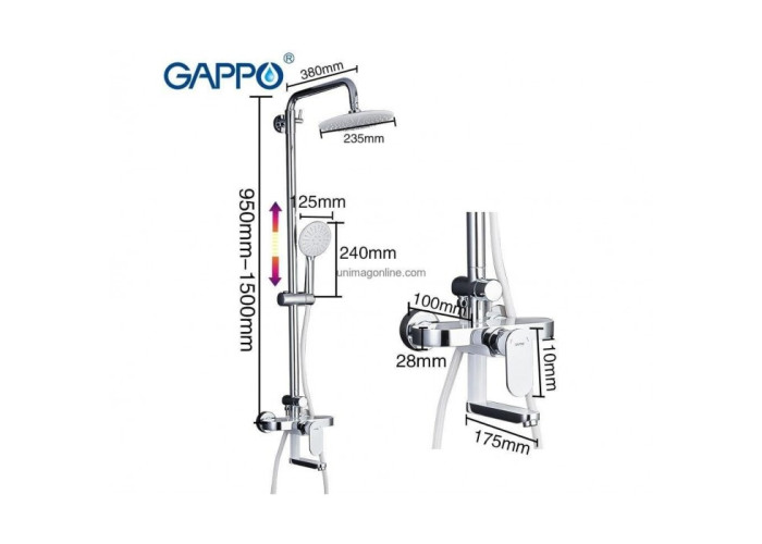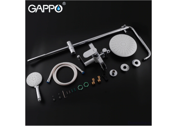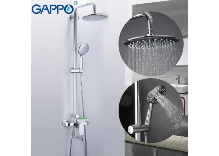 Душова стійка GAPPO G2419-8 складається з одноважільного змішувача, штанги, ручного душа, верхній лійки, шланга і власників. Змішувач обладнаний коротким поворотним виливом з аератором. Він зроблений з високоміцної латуні, має привабливе хромоване покриття. Пластикова стійка регулюється по висоті від 950 до 1500 мм. У її верхній частині закріплюється верхній душ діаметром 23 см.