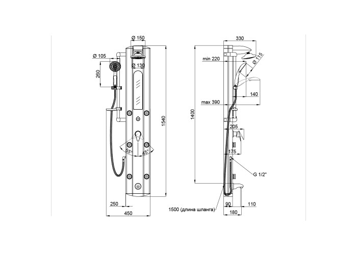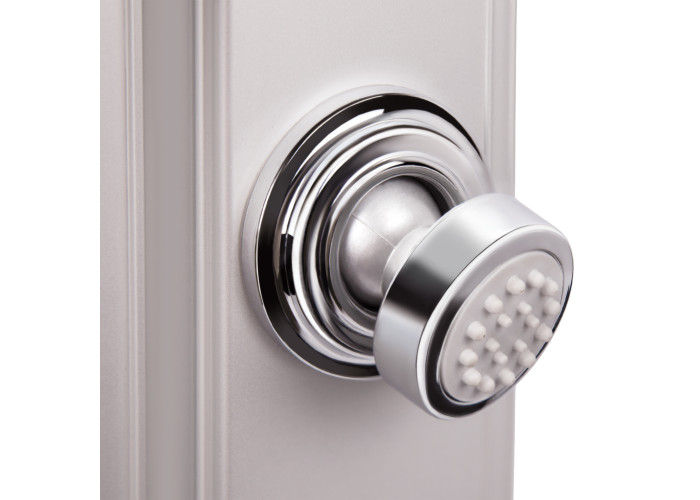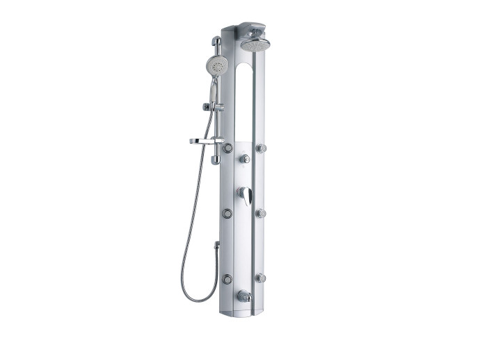 Душова панель з дзеркалом, змішувач, душові форсунки: 6шт, душова стійка, мильниця, лійка для верхнього душу, кронштейн для ручного душу, лійка для ручного душу, душовий шланг, кріпильні деталі.