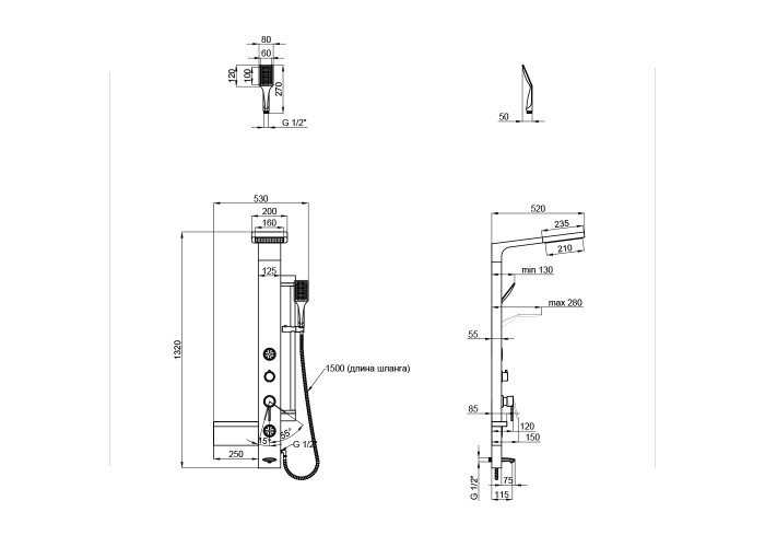 Душова панель з полицею, змішувач, душові форсунки: 2шт, душова стійка, лійка для верхнього душу, кронштейн для ручного душу, лійка для ручного душу, душовий шланг, кріпильні деталі.