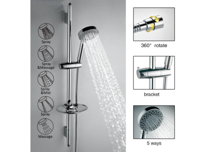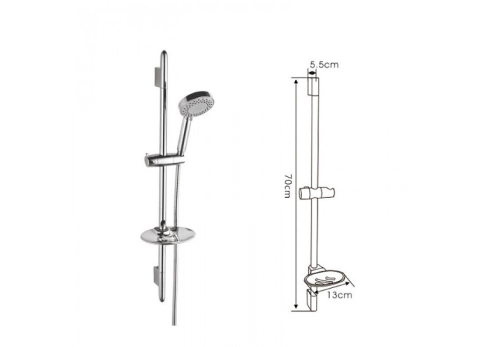 Крім цього гарнітур оснащений п'ятипозиційною душовою лійкою, шлангом 1500 мм для її підключення до змішувача, мильницею і кронштейном для лійки. Варто зазначити що шланг оснащений гайкою, яка дозволяє обертати лійку на 360 градусів. Таке рішення дозволить уникнути заломів, скручувань, а відповідно значно продовжити термін служби аксесуарів.