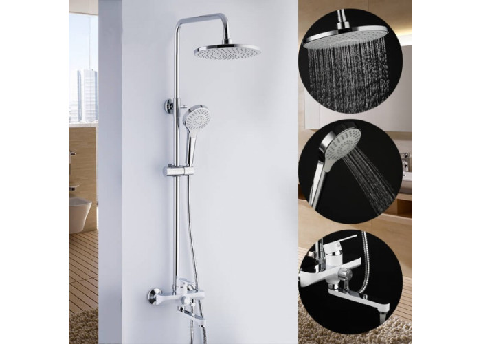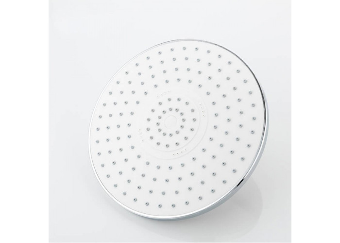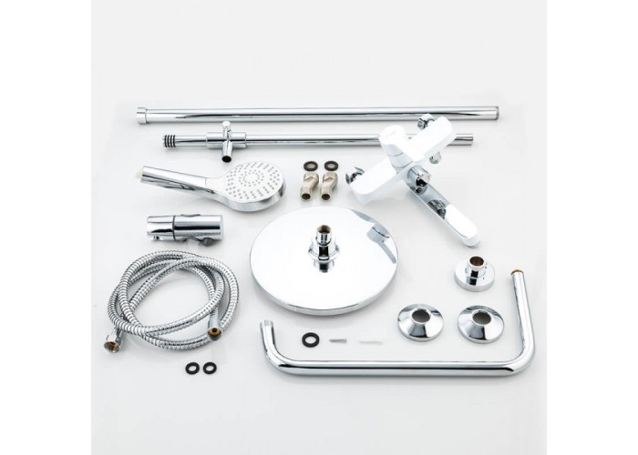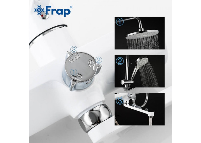 Душова система Frap H41 F2441 має короткий рухливий виливши і штангу тропічного душу. Це дозволяє прибирати обидві деталі в сторону, звільняючи простір. При покупці виробу варто враховувати, що верх корпуса змішувача хромований, а решта його компоненти пофарбовані білою фарбою. Він сам виготовлений з латуні, тому не іржавіє під дією вологи і вогкості. Її велика товщина перешкоджає його розтріскування.