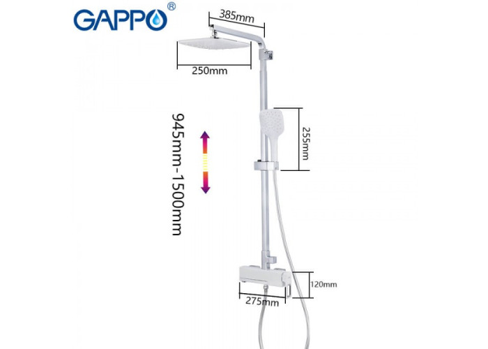 - Хромована душова стійка з регульованою висотою 945-1500 мм.