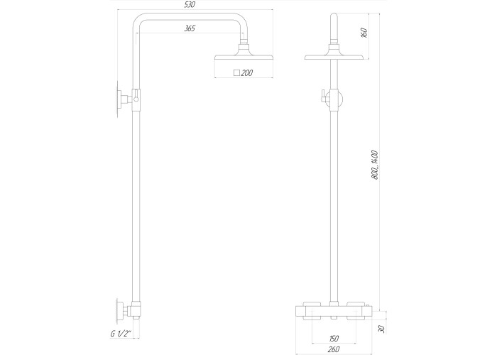 - верхній душ - квадратна лійка 20 см, стійка (80-140 см)