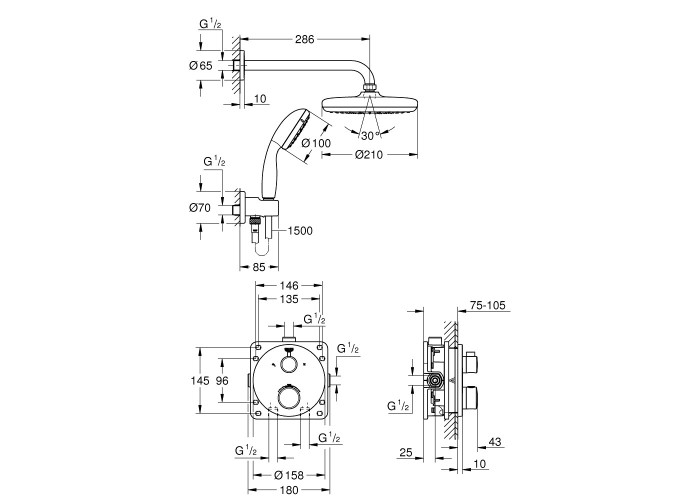 Душова система Grohe Grohtherm 34727000 складається з верхнього і ручного душу, змішувача. Прихований спосіб монтажу дозволяє збільшити варіанти розташування елементів системи, а наявність термостатичного змішувача дає можливість автоматично регулювати змішування води для більш комфортного користування.