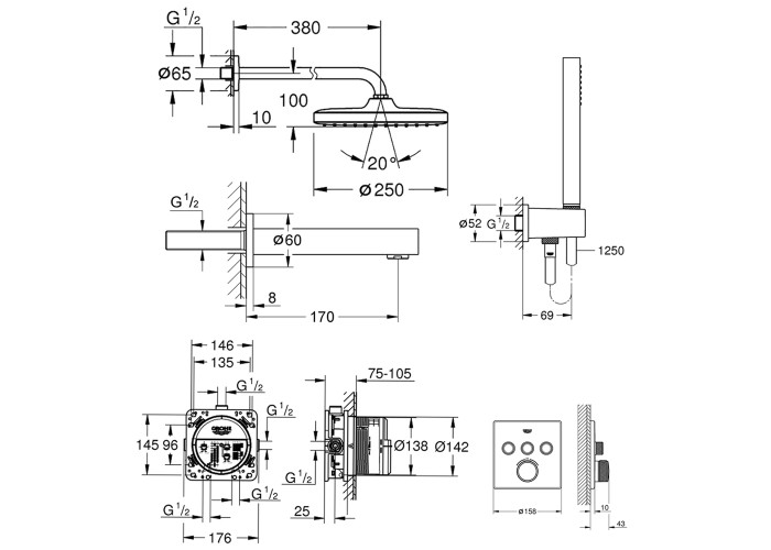 GROHE TurboStat - забезпечення і підтримання температури води. GROHE SafeStop - обмеження температури води до 38 °C. GROHE DreamSpray - оптимальний розподіл води по кожній душовій форсунці. GROHE StarLight - хромоване покриття. GROHE SpeedClean - запобігання утворенню вапняних відкладень. GROHE SmartControl - увімкнення-вимкнення та регулювання тиску. GROHE DripStop - не протікає ручний душ після припинення подачі води. GROHE ProGrip - ергономічні рифлені ручки.