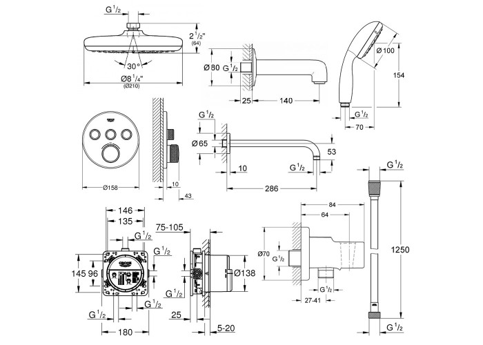 Змішувач, кронштейн для верхнього душу, лійка для верхнього душу, шлангове приєднання, лійка для ручного душу, душовий шланг, вилив, кріпильні деталі.