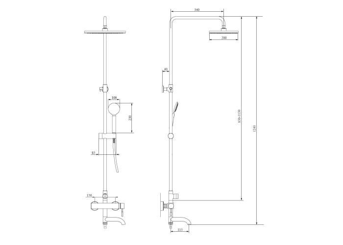 Змішувач, кронштейн для верхнього душу, лійка для верхнього душу, кронштейн для ручного душу, лійка для ручного душу, душовий шланг, душова стійка, кріпильні деталі.