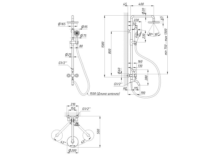 Змішувач, кронштейн для верхнього душу, лійка для верхнього душу, кронштейн для ручного душу, лійка для ручного душу, душовий шланг, душова стійка, кріплення.