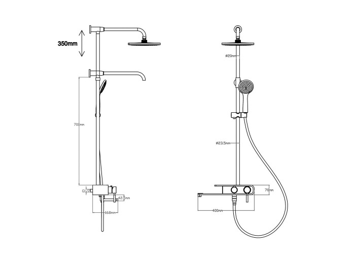 Змішувач з полицею, кронштейн для верхнього душу, лійка для верхнього душу, кронштейн для ручного душу, лійка для ручного душу, душовий шланг, душова стійка, кріпильні деталі.