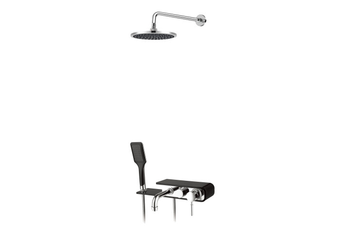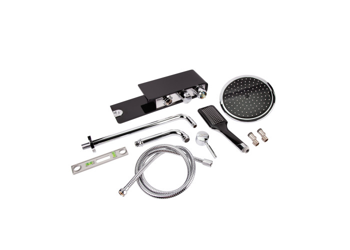 Змішувач з полицею, кронштейн для верхнього душу, лійка для верхнього душу, лійка для ручного душу, душовий шланг, кріпильні деталі.