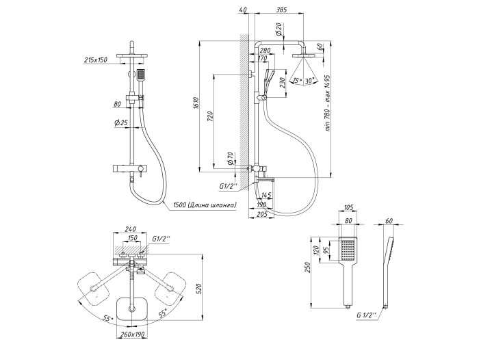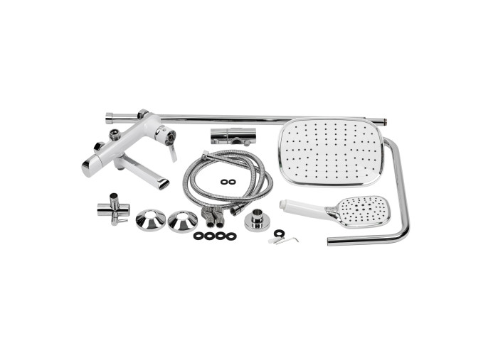 Змішувач, кронштейн для верхнього душу, лійка для верхнього душу, кронштейн для ручного душу, лійка для ручного душу, душовий шланг, душова стійка, кріпильні деталі.