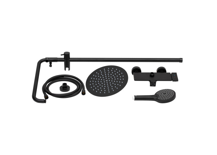 Змішувач, кронштейн для верхнього душу, лійка для верхнього душу, кронштейн для ручного душу, лійка для ручного душу, душовий шланг, душова стійка, кріпильні деталі.